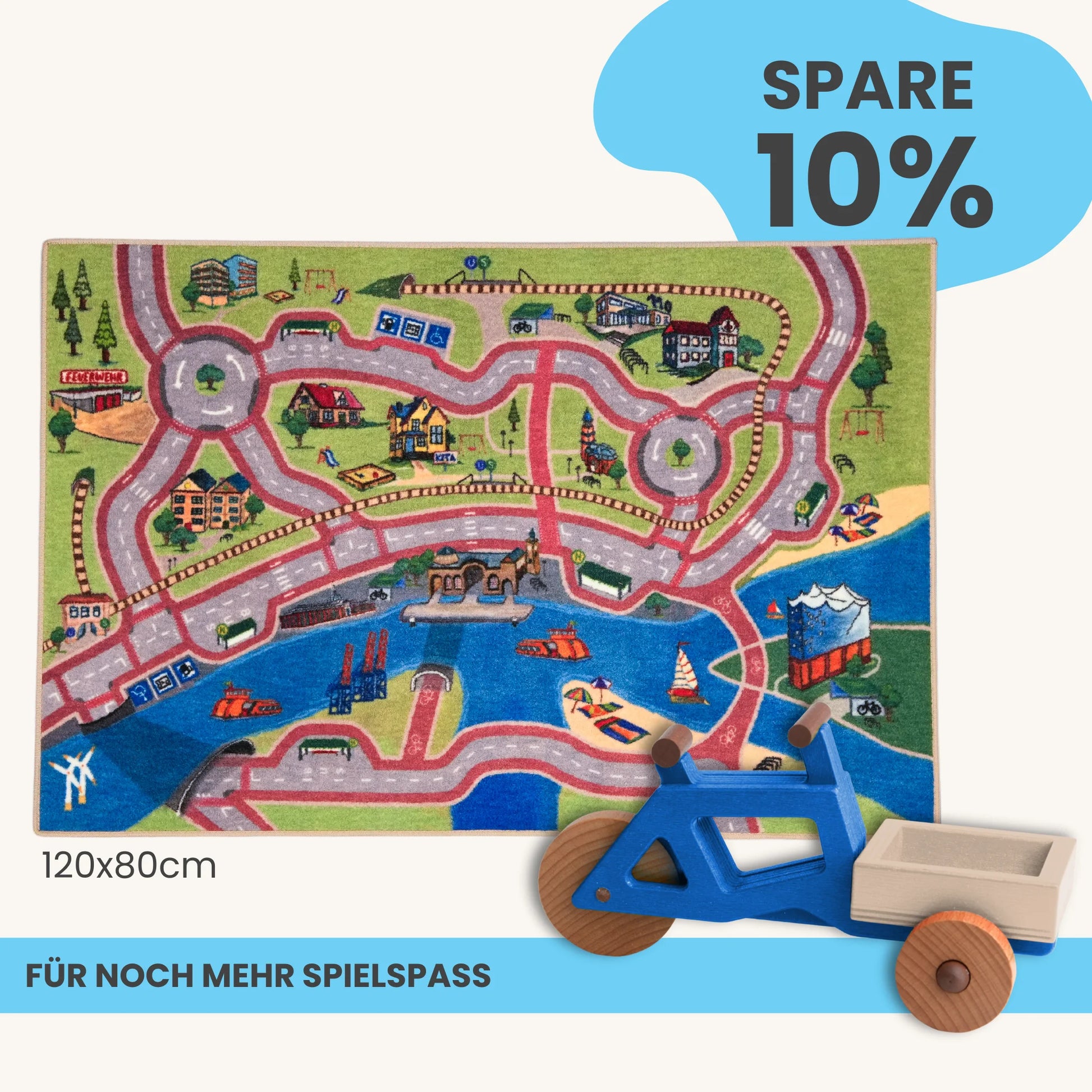 Das Hamburg Lastenrad-Set besteht aus einem Spielteppich Hamburg in deiner gewählten Größe (120x80 cm oder 175x115 cm), der GUT-zertifiziert und Made in Germany ist, sowie einem Holz-Lastenrad aus nachhaltigem Birken-Multiplex, das "spiel gut"-zertifiziert und in Polen hergestellt wurde.