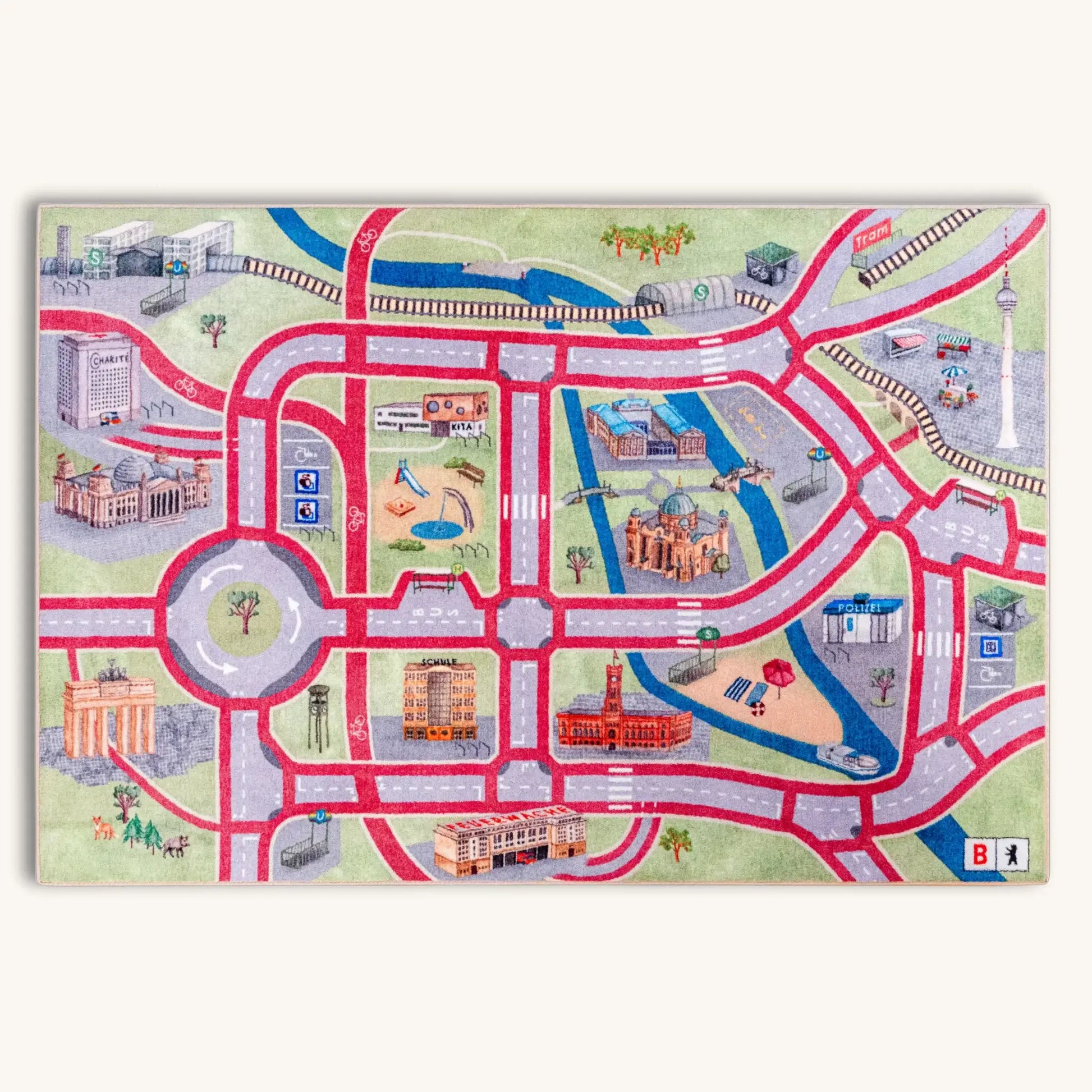 Der Spielteppich Berlin ist in zwei Größen erhältlich, die sich perfekt an unterschiedliche Raumgrößen und Bedürfnisse anpassen. Die große Version misst 175 x 115 cm und bietet viel Platz für ausgedehntes Spiel mit mehreren Kindern und vielen Fahrzeugen. Die kleine Version mit 120 x 80 cm ist ideal für kleinere Kinderzimmer oder als Ergänzung zu bestehenden Spielwelten. Beide Größen zeigen das gleiche liebevoll handgemalte Berlin-Motiv mit allen wichtigen Orten und Verkehrsmitteln und sind GUT-zertifiziert sowie Made in Germany.