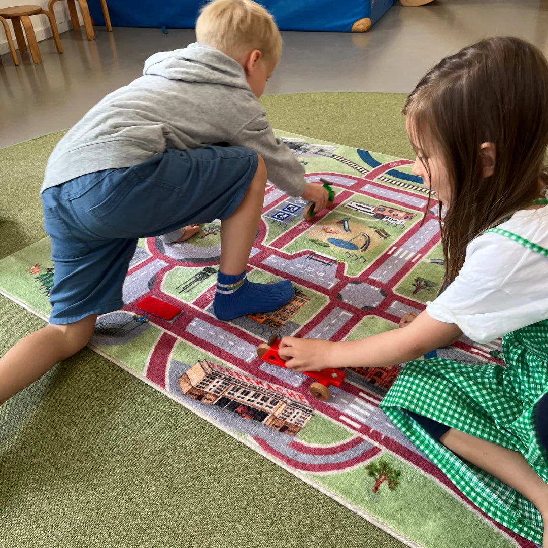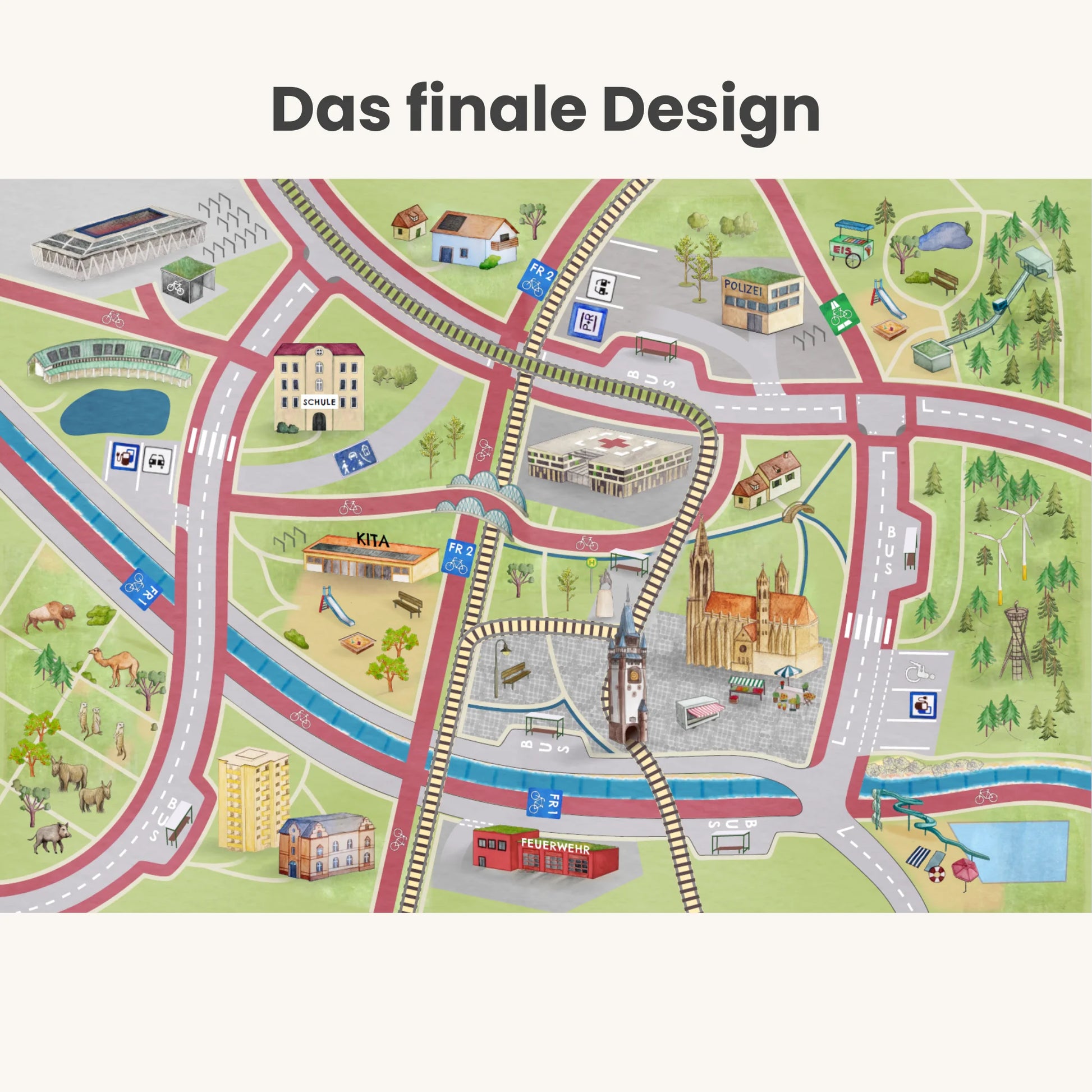 Der Spielteppich Freiburg zeigt authentische Orte, die Kinder aus ihrem Alltag kennen und lieben. Dazu gehören das Freiburger Münster mit seinem charakteristischen Turm, das historische Martinstor, die beliebte Schlossbergbahn, das SC-Stadion für kleine Sportfans, das Strandbad für sommerliche Spielszenarien und der Mundenhof als beliebtes Ausflugsziel. Der Teppich wurde in enger Zusammenarbeit mit Freiburger Verkehrsplanern und Pädagogen entwickelt und zeigt multimodale Mobilität mit Straßenbahnen, Fahrradwegen, Lastenrädern und Fußgängern, genau wie Kinder es in Freiburg täglich erleben.