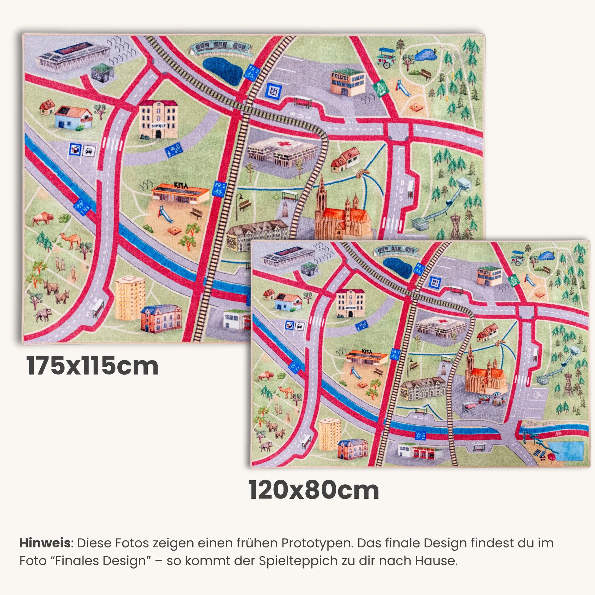 Der Spielteppich Freiburg ist in zwei Größen erhältlich, die sich perfekt an unterschiedliche Raumgrößen anpassen. Die große Version misst 175 x 115 cm und bietet viel Platz für ausgedehntes Spiel mit mehreren Kindern und vielen Fahrzeugen. Die kleine Version mit 120 x 80 cm ist ideal für kleinere Kinderzimmer oder als Ergänzung zu bestehenden Spielwelten. Beide Größen zeigen das gleiche liebevoll handgemalte Freiburg-Motiv mit allen wichtigen Orten und sind GUT-zertifiziert sowie Made in Germany.