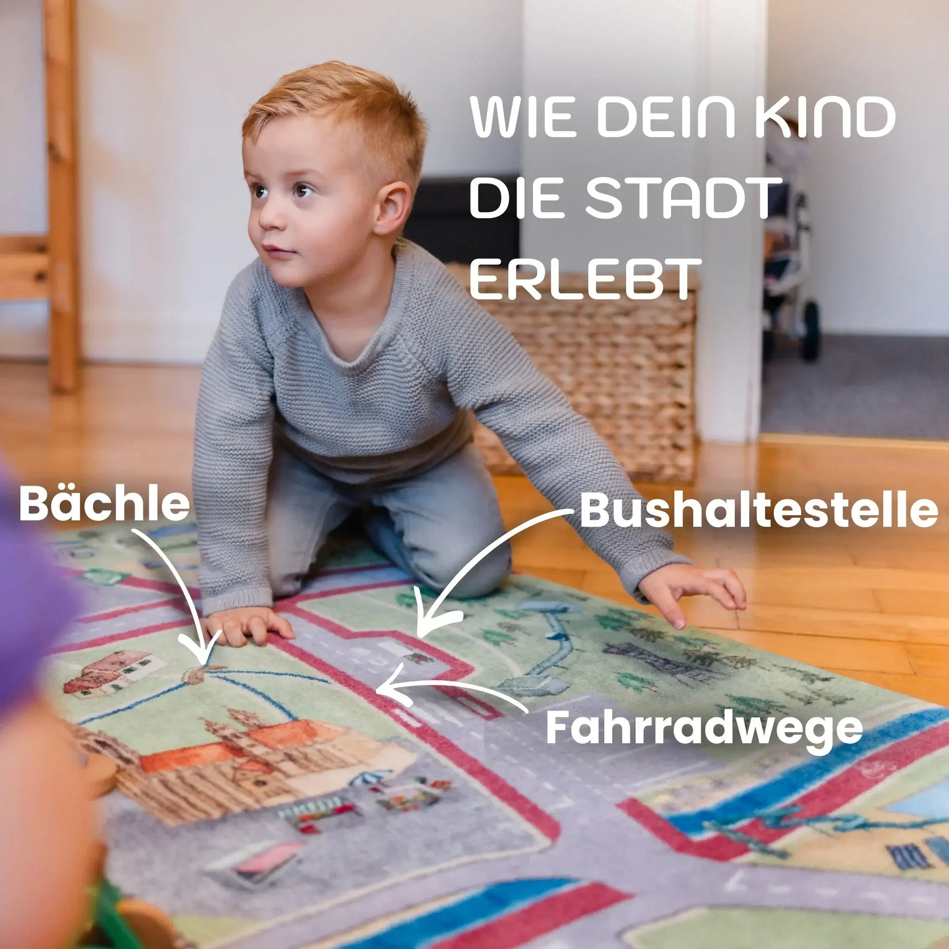 Absolut! Viele Eltern berichten, dass ihre Kinder den Spielteppich über Monate und sogar Jahre hinweg immer wieder neu entdecken. Durch die realistischen Stadtmotive, die vielen kleinen Details und die vielfältigen Spielmöglichkeiten bleibt der Teppich spannend – egal ob alleine, mit Geschwistern oder Freund:innen. Die unterschiedlichen Szenarien laden zum kreativen Rollenspiel ein und wachsen mit den Interessen deines Kindes mit. So wird der Teppich garantiert nicht nach ein paar Tagen langweilig, sondern begleitet euch durch viele Spielphasen.